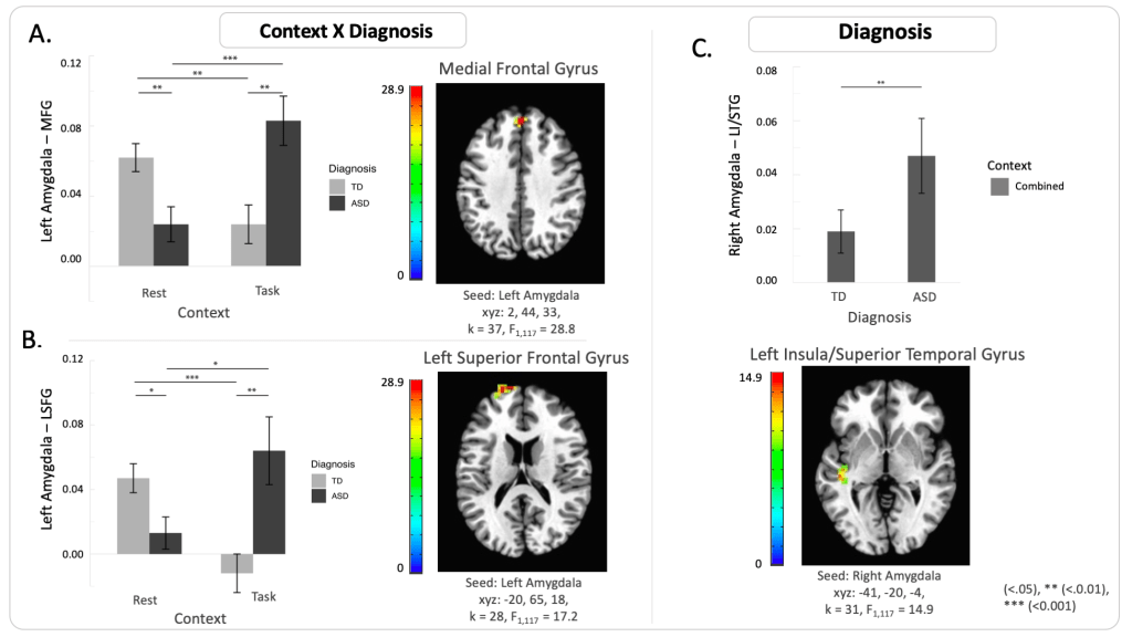 Christian, I. R., Liuzzi, M. T., Yu, Q., Kryza-Lacombe, M., Monk, C. S., Jarcho, J., & Wiggins, J. L. (2022). Context-dependent amygdala-prefrontal connectivity in youths with autism spectrum disorder. Research in Autism Spectrum Disorders, 91, 101913.